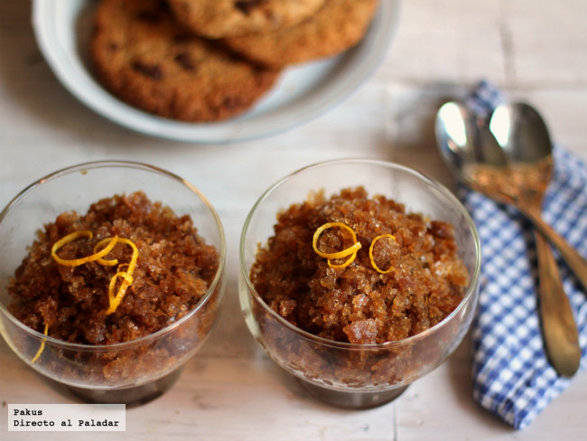 Volvemos a introducir en el congelador y repetimos la operación cada 30 minutos, hasta que todo el contenido sean pequeños cristales, similares a hielo picado. Cada vez el color de la mezcla será más dorado y menos oscuro. Servimos los granizados de café en vasos de cristal que permitan disfrutar de la visión de los cristales y decoramos con unas tiritas finas de corteza de limón.