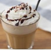 Un cappucino o café con leche, azúcar, nata montada, sirope chocolate (o caramelo) y hielo picado. Opcional, helado nata, choco o vainilla.