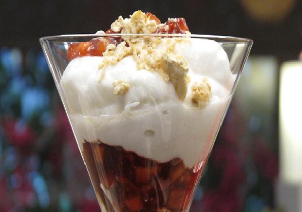 Para el montaje ponemos en la base un poco de turrón rallado, la mermelada con fresas y luego la crema de petitsuisse. Coronamos con un poco de mermelada con fresas y turrón rallado.