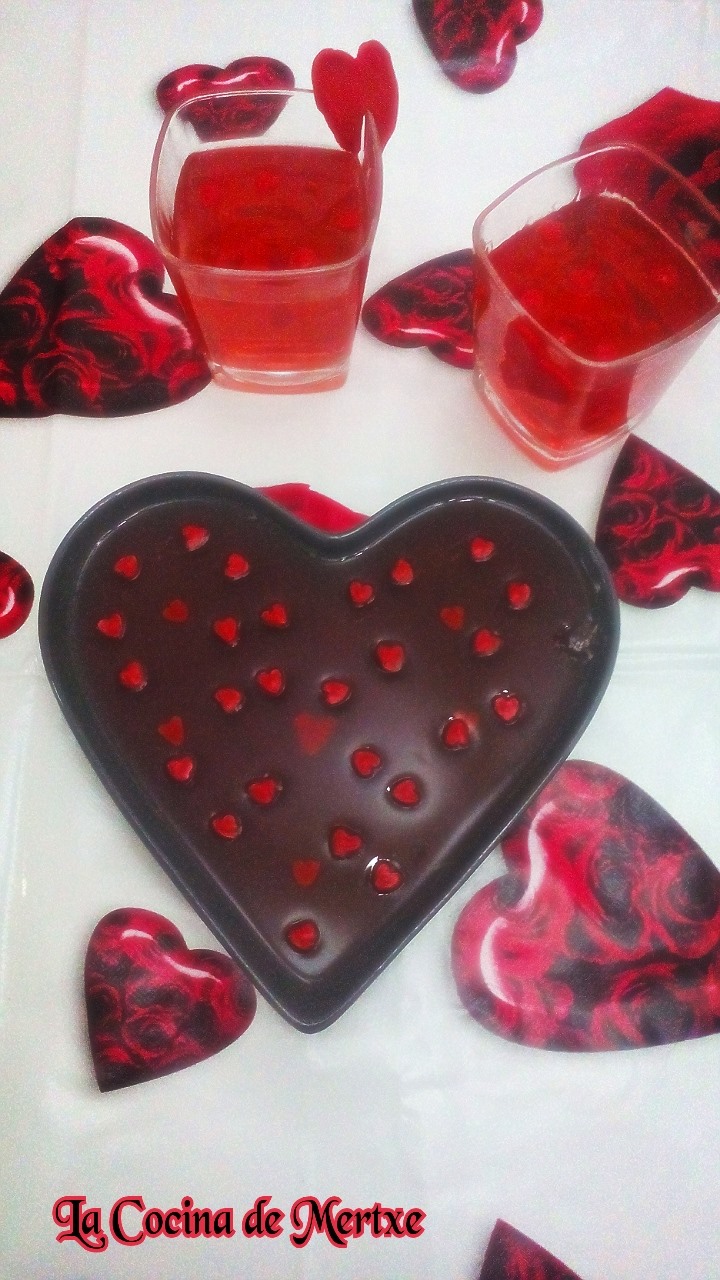 Cuando la gelatina esté a medio cuajar sacamos de la nevera y le ponemos los corazones. Algunos se irán hacia abajo quedándose a media altura. Metemos de nuevo la gelatina a la nevera para que termine de hacerse y cuando esté le ponemos el resto de corazones por encima.