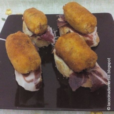 * Una vez fritas las croquetas las podemos poner en un plato con papel absorbente para quitar el exceso de aceite y a continuación ponerlas encima de las lonchas de jamón ibérico.