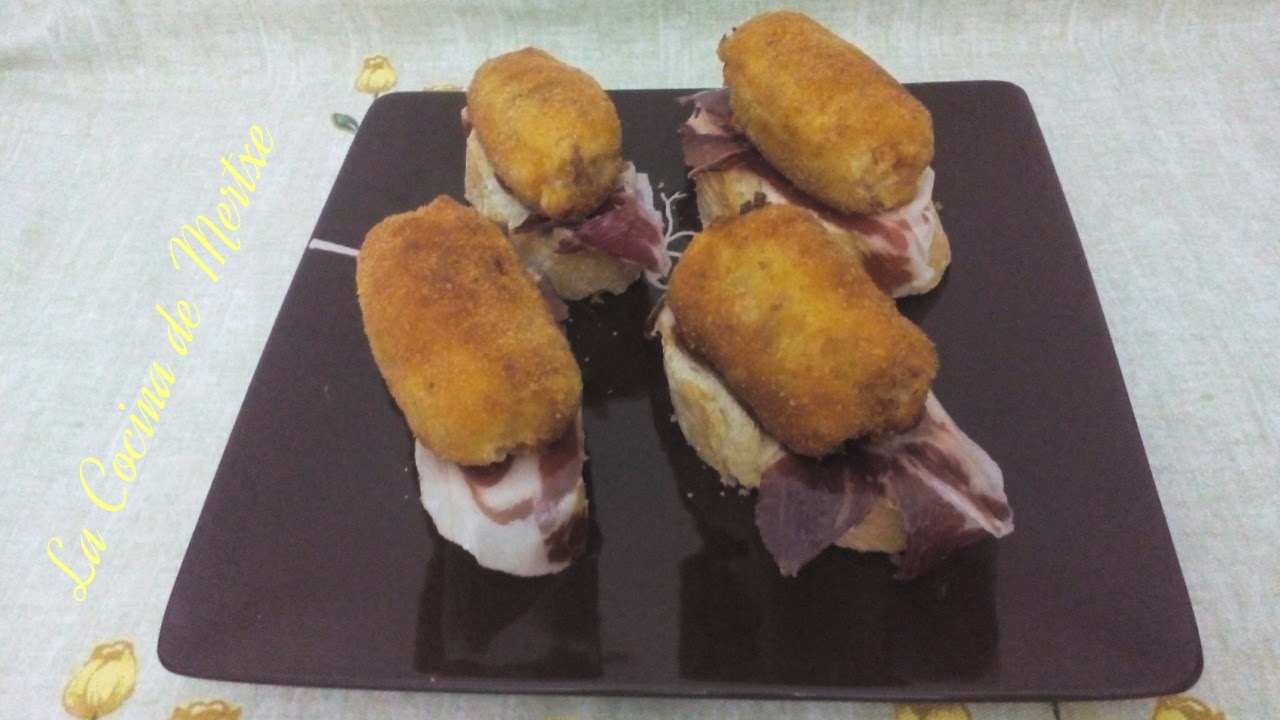 Seguido las pasamos por el huevo y otra vez por el pan rallado y vamos poniéndolas en la sartén para freír. Mientras se hacen cortamos cuatro rebanadas de pan y ponemos las lonchas de jamón reservadas encima del mismo.