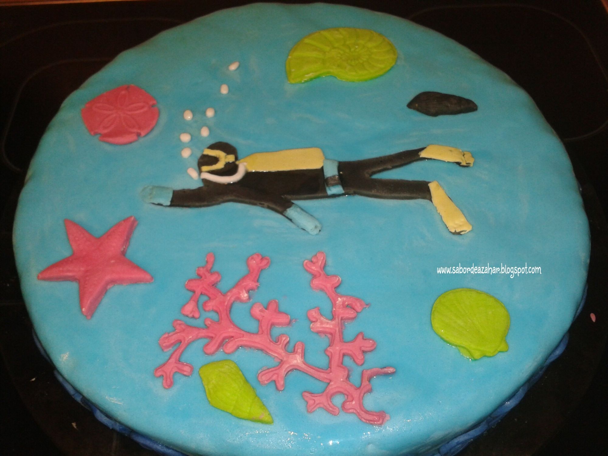 Esta tarta la preparé para el cumpleaños de mi marido. Le encanta bucear y la verdad es que le hizo mucha ilusión porque me ayudaron mis hijos a prepararla. Era la segunda, por lo que faltas tiene para aburrir, pero fue muy divertida hacerla. Esta tarta es como todas las recetas que os enseño, rápida y fácil.