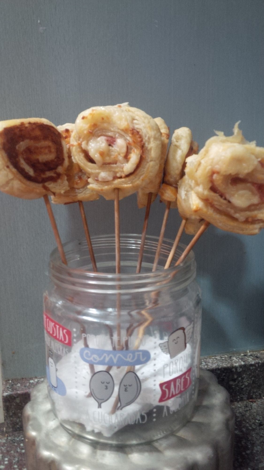 Enrollar y pinchar las brochetas. Pincelar con el huevo batido.