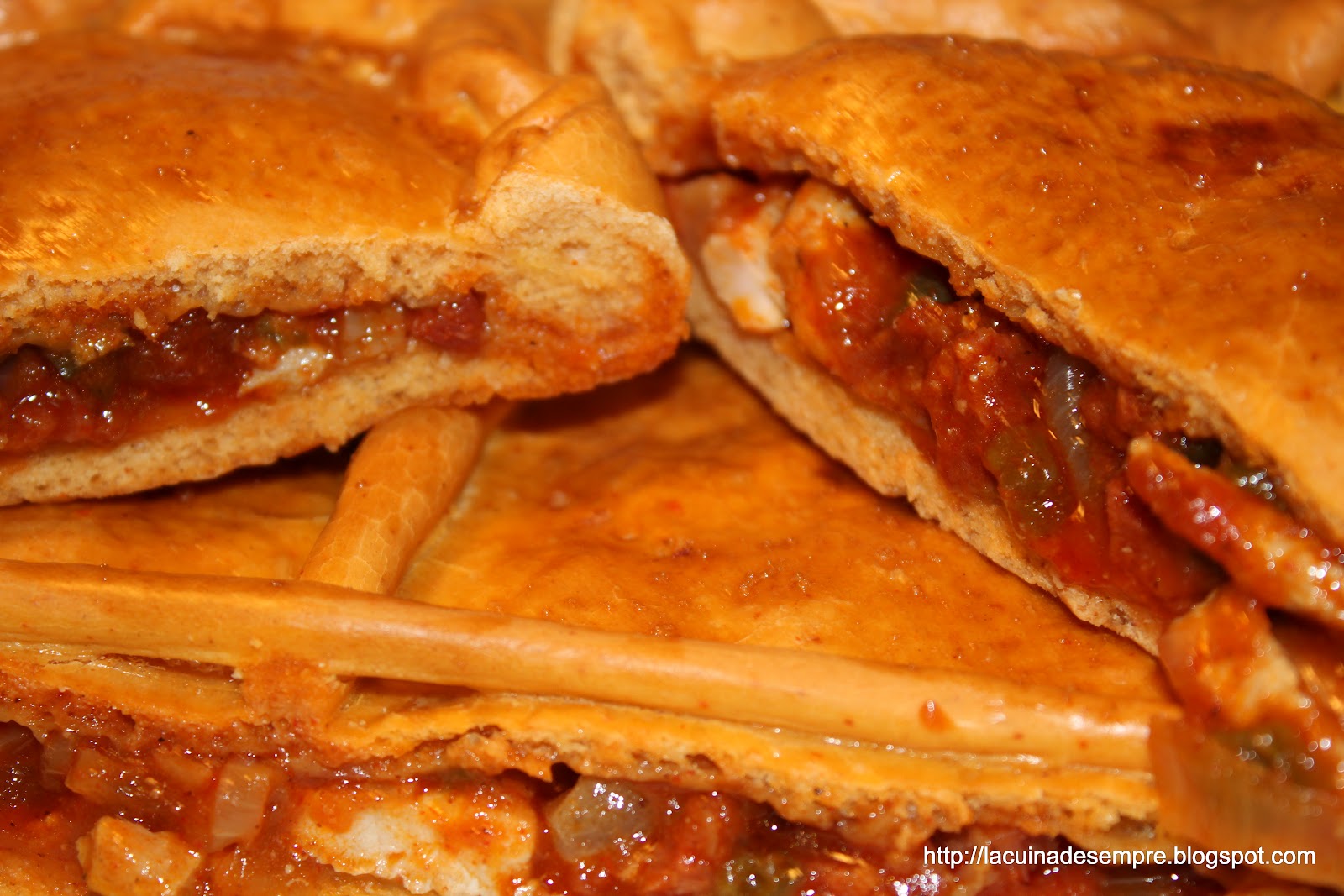 Posem la farina, el llevat, l'aigua el pebre vermell i el sofregit en la màquina d'amassar. També podem fer la massa a mà. Quan estigui feta, funyirem la massa, farem una bola i la deixarem llevar una hora tapada amb un drap. Passat aquest temps la massa haurà doblat la seva mida inicial. L'abaixarem, funyirem i farem una nova bola. Ara, farem boles d'uns 350 g. i la resta la deixarem per decorar l'empanada. Deixem reposar les boles 10 minuts... i amb l'ajuda d'una mica de farina, les estirarem fins que tinguin la mida de la safata de forn.