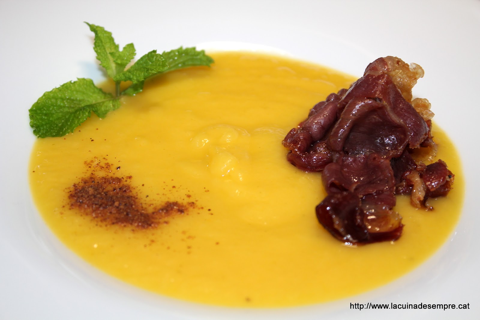 Per presentar-la, es pot posar una mica de pernil ibèric que fregirem uns segons fins que quedi cruixent. També podem posar un polsim de nou moscada en un costat....