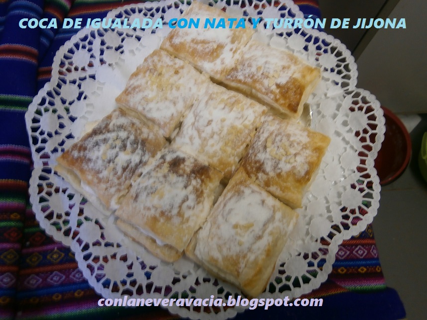 Está coca la descubri en mi primer viaje a Igualada. Al pararme a ver el escaparate de la Pasteleria Pla la vi. Me comento la dueña de la pasteleria que las crearon en 1920 y se han convertido en un postre típico de Igualada.
