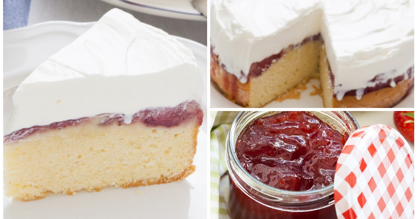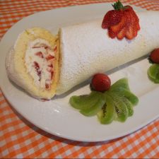 Verter el sirope sobre el bizcocho. Sobre este, extender la crema de nata montada y decorar con los trozos de fresa a vuestro gusto.