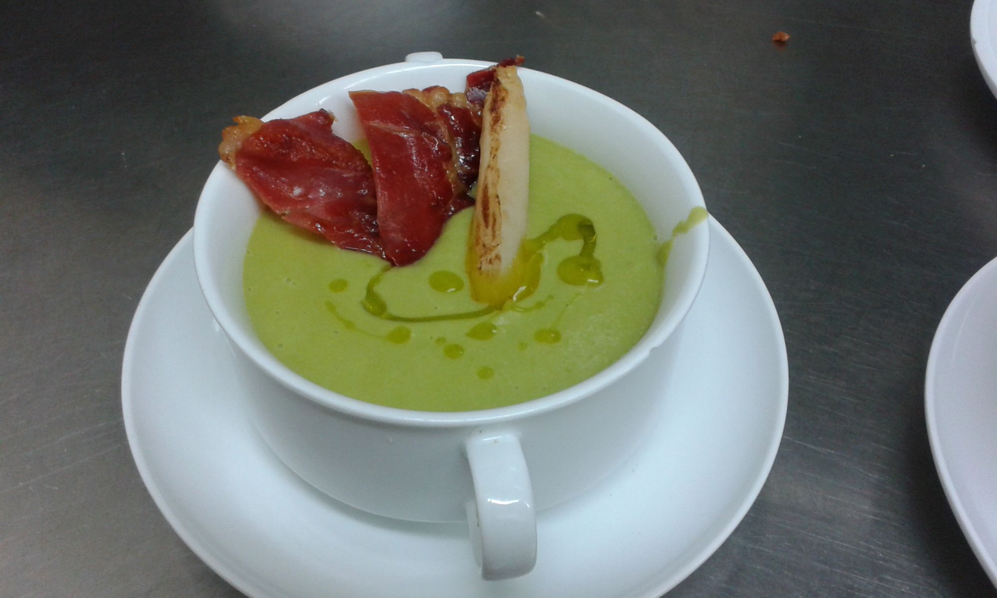 Servir y decorar con el jamón y la punta de esparrago pasada antes por la plancha y chorrito de aceite de oliva.