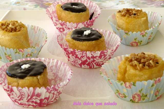 Colocamos los pastelitos en cápsulas de papel, verticalmente. Ponemos una cucharadita de crema encima de cada pastel. Espolvoreamos con azúcar y quemamos con un soplete. o, como hice yo la primera vez, espolvoreamos con almendras crocanti o con una capa de chocolate negro que, previamente habremos fundido al baño maría o en el microondas.