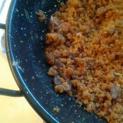 Añadimos el pan y removemos con una espumadera para que se impregne del aceite. Con la misma espumadera vamos golpeando el pan para que se vaya picando y seguimos removiendo hasta que el pan se vaya secando, proceso que como antes indicaba, puede llevarnos 1 hora como mínimo. Por último, añadimos el pimiento, el chorizo y el tocino y lo mezclamos todo bien.