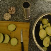 mezclando el orégano, 150 ml de aceite de oliva, la pimienta y los dientes de ajo bien picados, albahaca, ají molido... vierte sobre las berenjenas y remueve para que queden bien cubiertas.