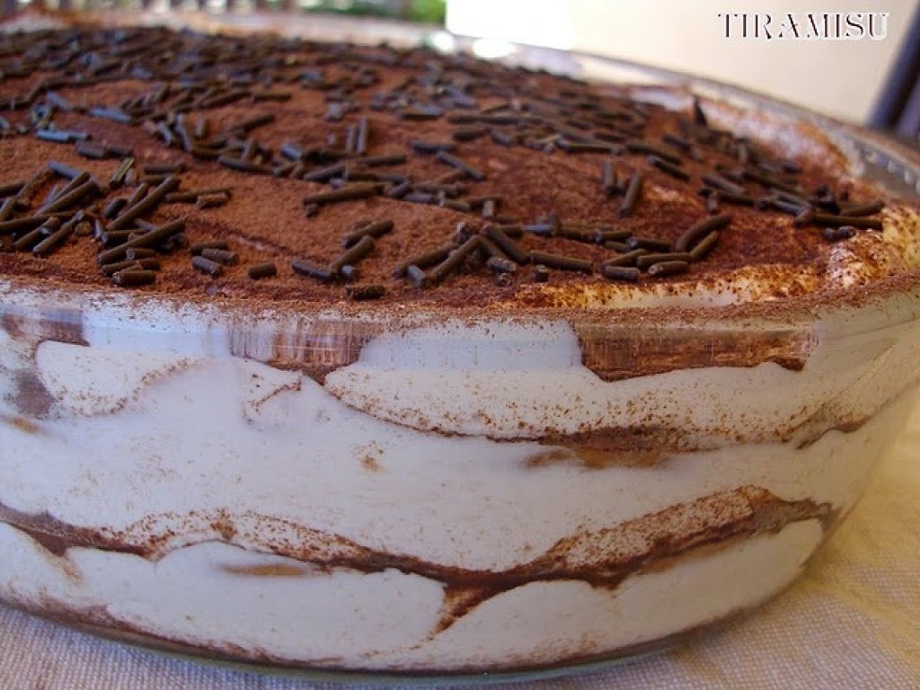 En una fuente para postres, disponer una capa de bizcochos, empapados con café. y disponer una capa de crema de mascarpone y espolvorear un poco de chocolate, añadir otra capa de bizcochos, empapar con café, añadir otra capa de crema de mascarpone, y repetir la operación hasta acabar con los ingredientes. Recordar que la última capa tiene que ser de crema. Espolvorear con el cacao. Dejar en la nevera, cubierto con film transparente, 3 horas antes de comer.
