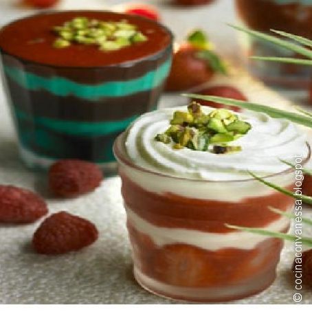 Montaje: Cubrir el fondo de una copa con las fresas fileteadas. Añadir un poco de crema, volver a poner una capa de fresas trituradas y otra de crema encima. Enfriarlo en la nevera durante 2 horas aprox. Espolvorearlo con el pistacho picado. Servirlo frío.