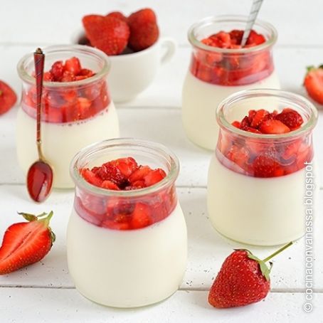 Panna cotta: 550gr de nata en un cazo a hervir. Cáscara de uno o dos limones bien lavados (la parte amarilla). Cuando hierva se añade las cáscaras de limón y se retira el cazo del fuego. Unos 30 minutos. Colar bien encima de un cazo con 85gr de azúcar e incorporar una hoja de gelatina disolviéndose. Llenar 4 tarros de yogur de cristal y meter en la nevera 2 o 3 horas. (Están cremosas, si se quiere más consistencia poner más gelatina) Para acabar 100gr de fresas troceadas y 100 gr de jugo de fresas mezclado; y echar un poco en cada panna cotta.
