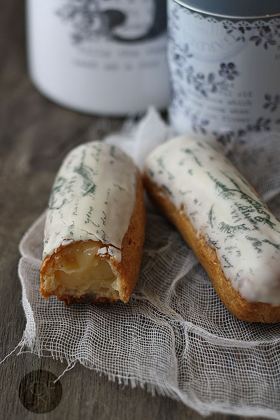 Fundimos el chocolate blanco en el microondas .Bañamos los éclairs en el glaseado de chocolate, dejando escurrir el sobrante. Dejamos solidificar en el frigorífico.