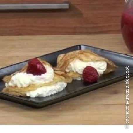 Crepes enrolladas, rellenas de nata líquida, bañadas con chocolate.