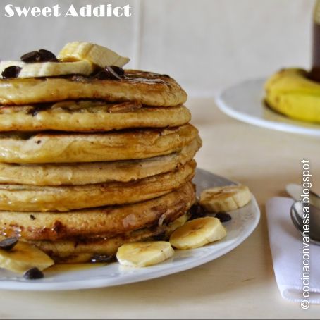 Mete el pancake en el horno y repite la operación de mojar con mantequilla la sartén y formar más pancakes. Puedes servirlos acompañados de sirope de arce, miel o mermelada. (Otra opción es añadir arándanos o cualquier otra fruta en lugar del chocolate a la masa; y luego nada de plátano claro)