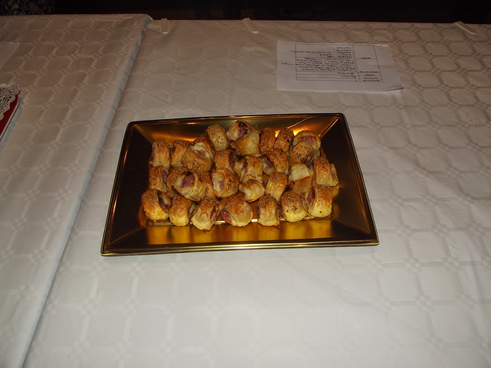 Con la otra lámina estirada y también la cortamos por la mitad en vertical y rellenamos ocn salchichas crudas, queso y hierbas provenzales. Enrollamos y cortamos a pequeños trozos. Barnizamos con el huevo y por encima ajonjolí y a una bandeja de horno .