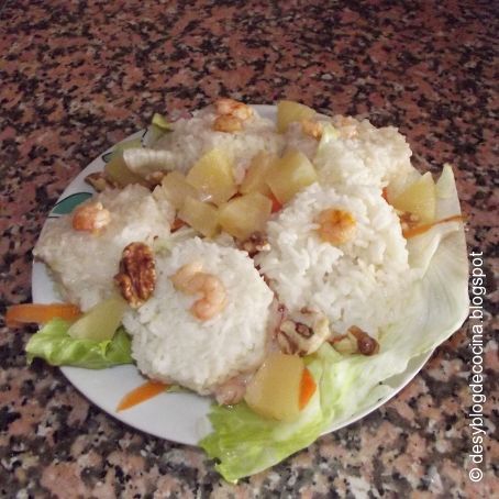 Vamos removiendo el arroz para que no se pegue. Y cuando este hecho (quedará un tipo rissotto) lo enplatamos sobre las hojas de lechuga y tiras de zanahoria. Después sobre el arroz añadimos las gambitas, la piña, las nueces y rociamos sobre el arroz un poco de salsa de coco con ayuda de una cuchara para no pasarnos.