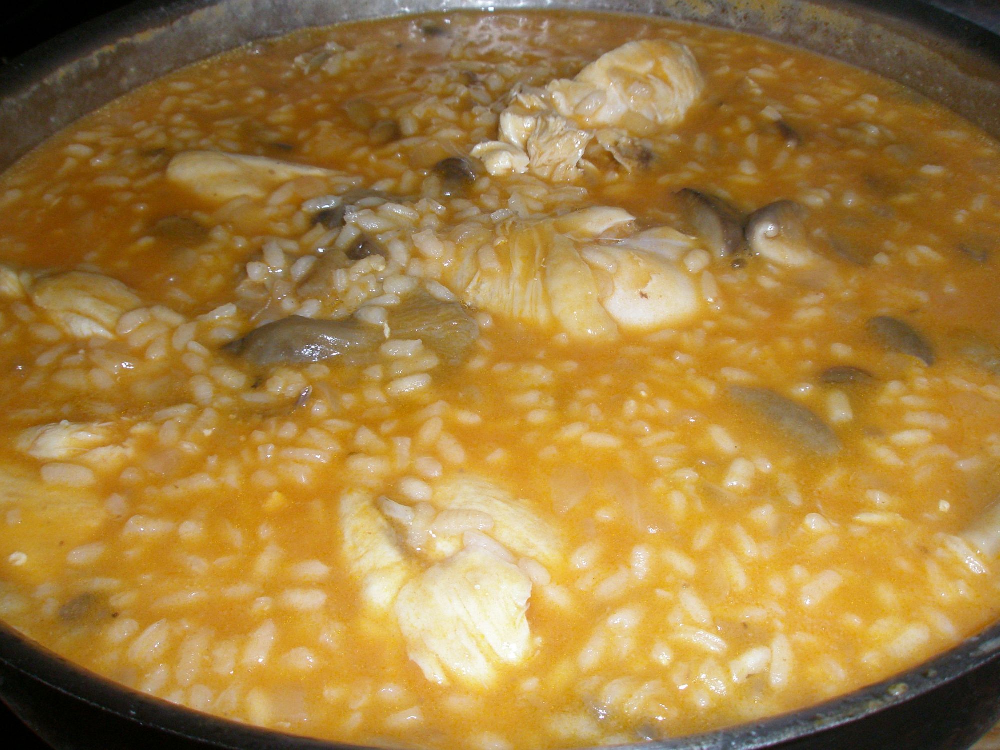 Sofreir el arroz con el sofrito durante un minuto, añadir el pollo, las setas y el caldo caliente. Dejar hervir el conjunto durante 20 minutos a fuego medio (hasta que veamos que el arroz está hecho) y dejar reposar 5 minutos.