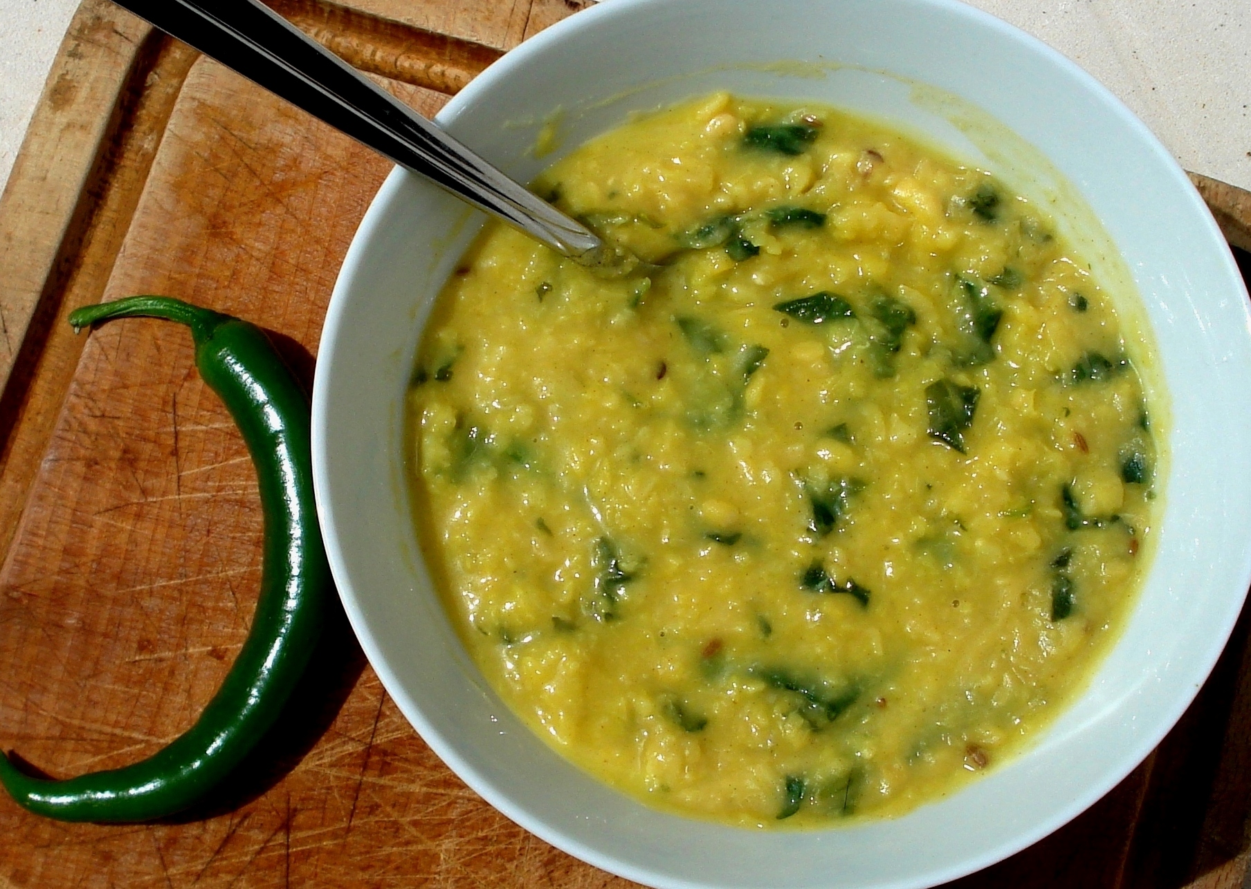 Mezclar las espinacas en el cazo, cocinar 1 minuto más para que se ablanden y añadir las judías Moong con 1 taza de agua. Envolver todo bien y llevar a cocer 2 a 3 minutos.