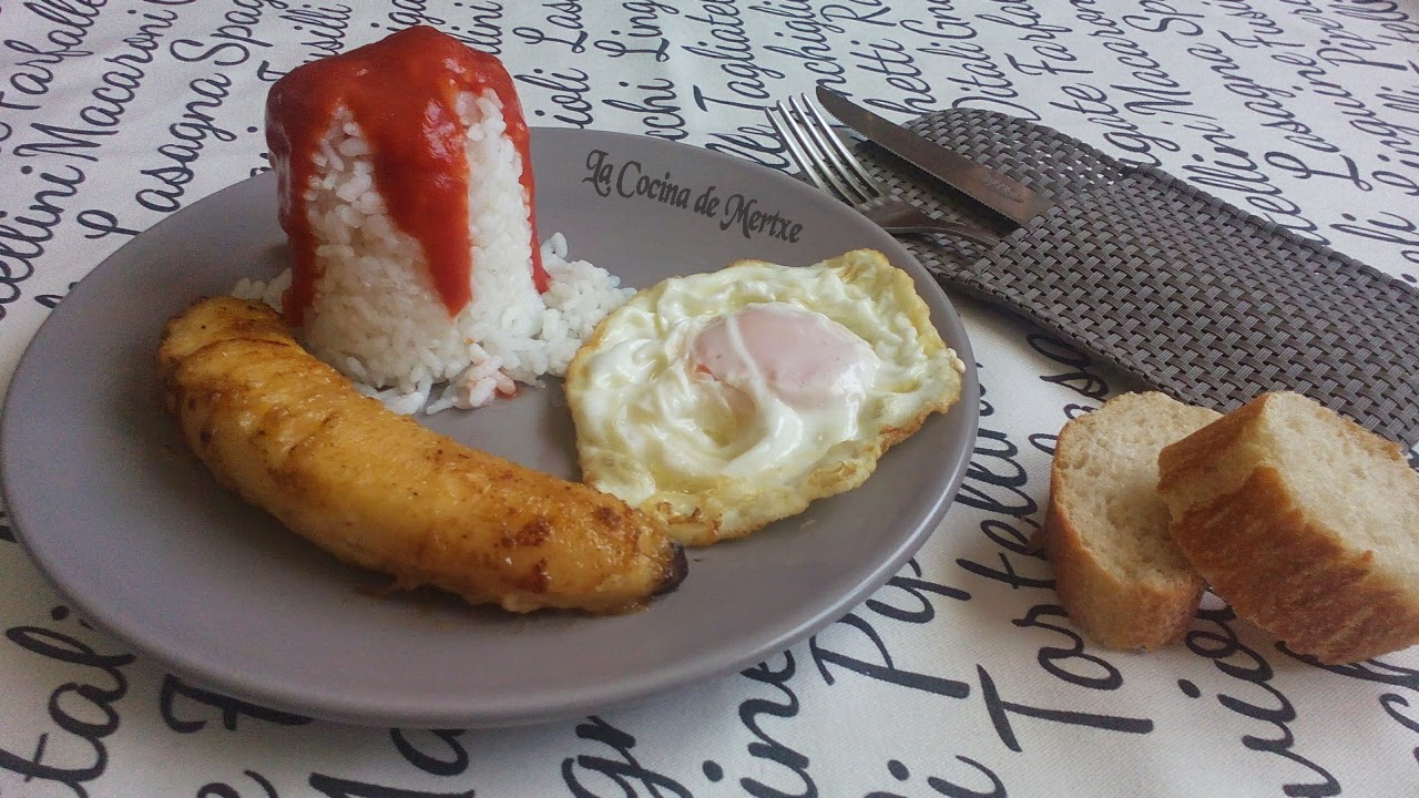 * En otra sartén ponemos una pequeña cantidad de margarina y cuando la tengamos derretida a fuego medio, pelamos y ponemos en ella el plátano a freír por ambos lados hasta que veamos que adquiere un color dorado. Servimos junto al arroz y el huevo.