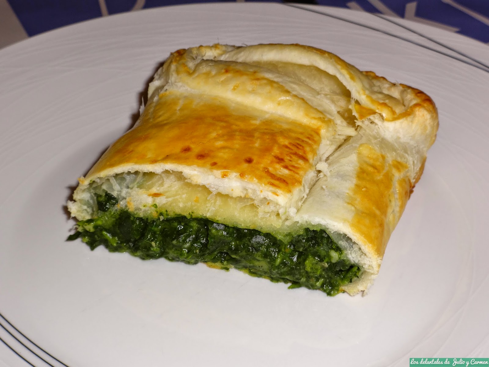 Extendemos la masa de hojaldre y la pinchamos en toda la superficie con un tenedor. Pondremos abundante cantidad de espinacas en el centro, dejando un espacio en los bordes. Enrollamos para formar una especie de tubo y lo cerraremos y aplastaremos en los extremos con un tenedor. Volveremos a pinchar un poco la superficie y lo pondremos en una bandeja de horno con papel vegetal.