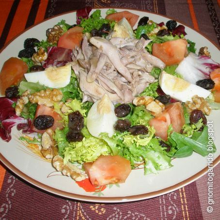 En una fuente de servir, ponemos la lechuga, encima el tomate pelado y cortado en cuadritos, el huevo duro cortado en cuartos, las pasas y las nueces.