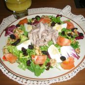Cogemos el escabeche que teníamos reservado, lo colamos, le añadimos un poco mas de aceite y lo batimos con un tenedor hasta que emulsione y quede una salsa opaca. La añadimos por encima de la ensalada y servimos inmediatamente. El resto de la salsa la servimos en una salsera por si algún comensal quiere un poco mas.