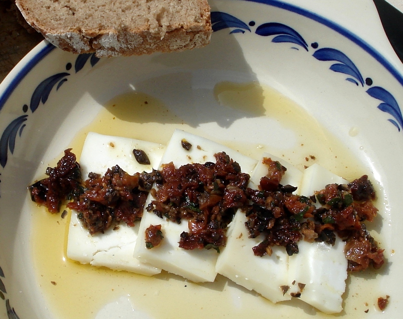 Lonchear el queso y colocarlo sobre un plato, regar con la salsa de tomate y servir con pan.