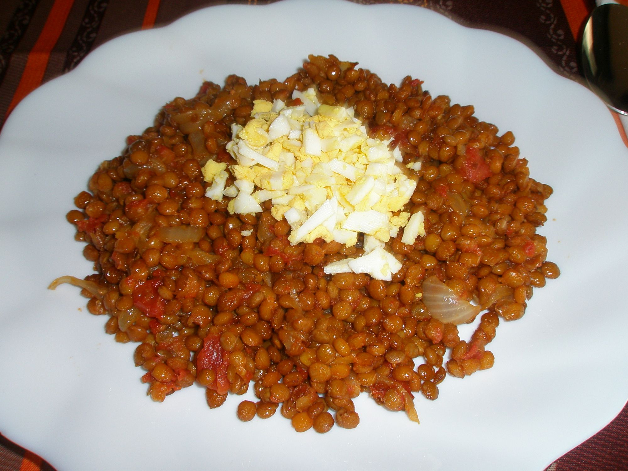 Introducimos ahora las lentejas escurridas y mezclamos. Dejamos que se cocine todo junto durante 10 minutos mas con cuidado porque las lentejas fritas saltan, así que mejor poner una tapadera e ir removiendo cada 2 minutos.