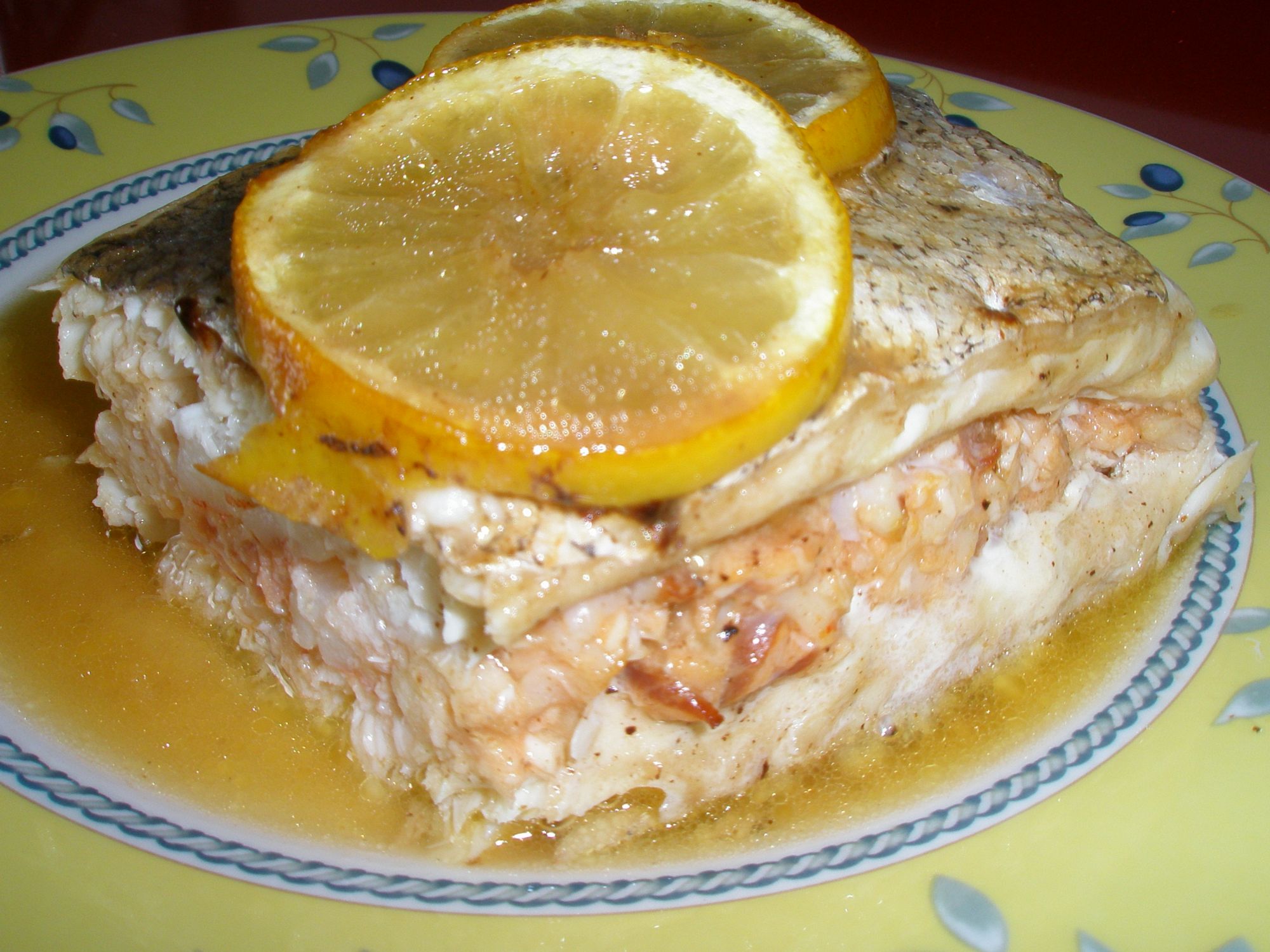 Precalentamos el horno a 180°. Rociamos la merluza con el jerez, ponemos encima unas nueces de mantequilla y el limón cortado en rodajas alrededor, metemos en la parte baja del horno durante 30 minutos, rociándola de vez en cuando con el líquido que va soltando.