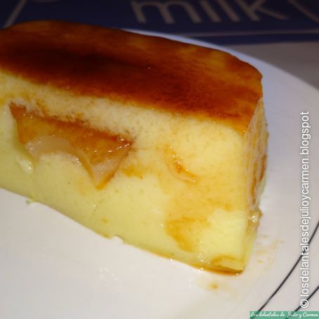 Echamos caramelo líquido en el molde que tengamos (uno alargado va de maravilla). En este momento podemos hacer dos cosas para decorar: podemos poner la piña sobre el caramelo, de forma que después la piña subirá y quedará en mitad de la tarta, o bien, una vez que esté terminada y la desmoldemos, poner trozos de piña encima, o directamente podemos dejarla así sin mas, sin añadir nada mas como decoración. Depende de cada uno.