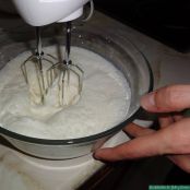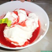 Vertemos la nata sobre el preparado de fresas y con movimientos envolventes y lentamente, iremos uniendo la nata con las fresas.