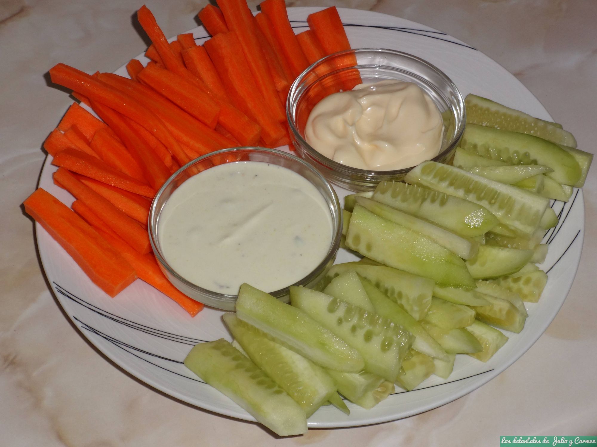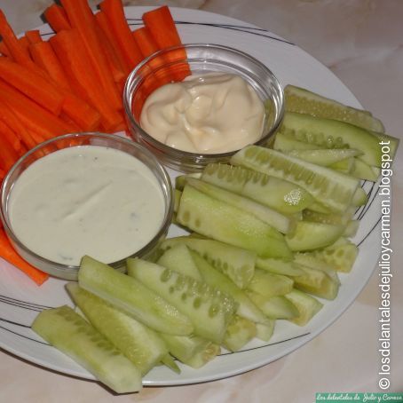 Bastones de pepino y zanahoria con salsa de yogur