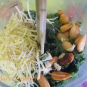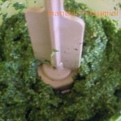 Mezcla las espinacas, pin ones o almendras o nueces...lo que tengas, el ajo, el aceite de oliva y el queso parmesano, añade un poco de sal y pimienta
