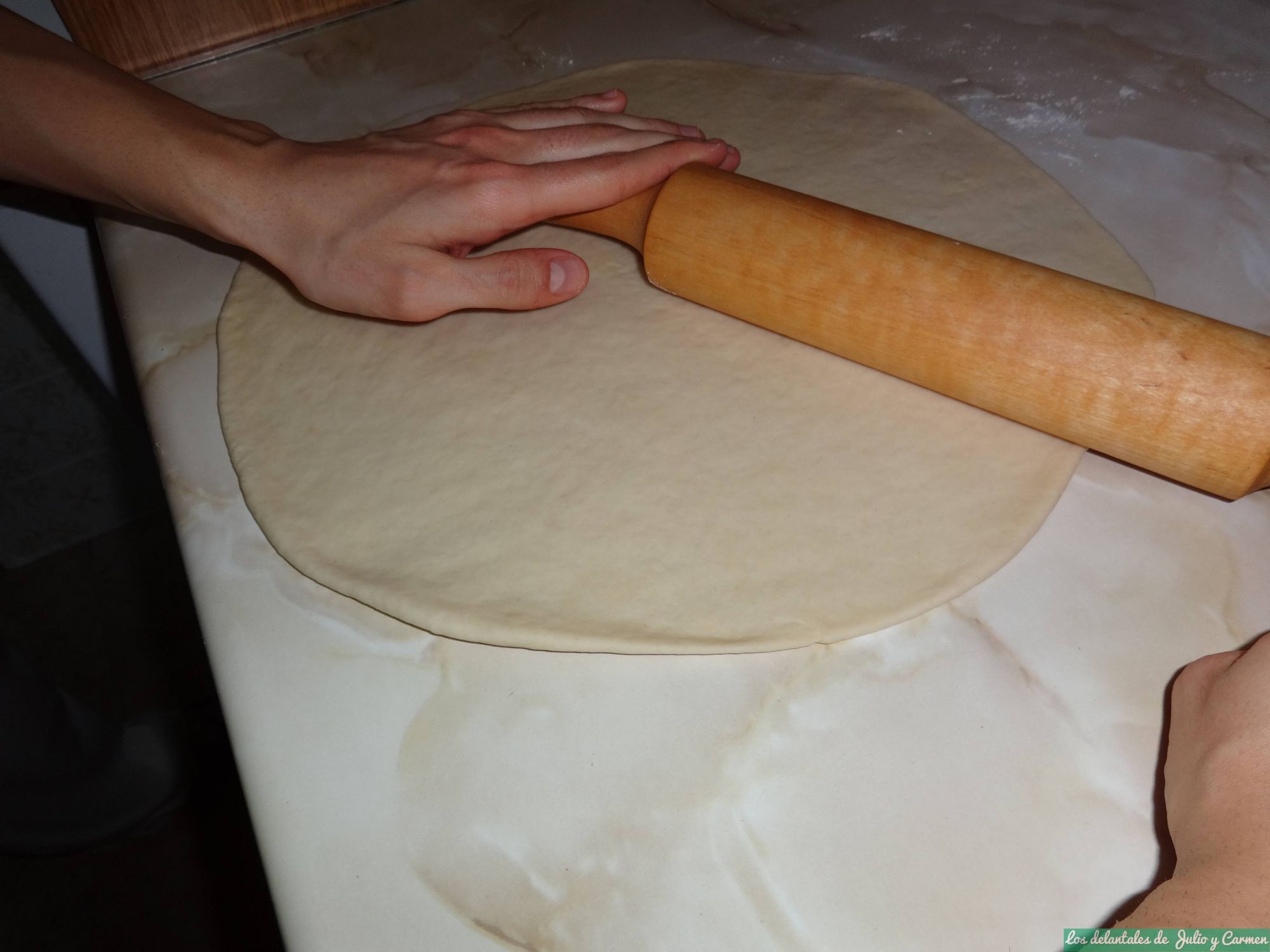 Estiraremos, formando un circulo y dejándola lo mas finita que podamos (ya que después crecerá en el horno) o del grosor que deseemos.