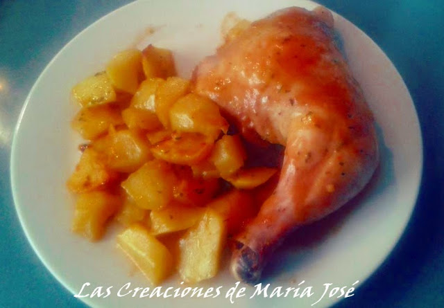 Salpimentar los muslos. En un vaso echar todas las especies con el vino y 2 cucharadas de agua, mezclar todo bien. Meter los muslos en la bolsa de asar junto con las patatas, echar la mezcla, cerrar la bolsa y mover todo para que quede bien mezclado. Meter al horno a 200° 60 minutos.