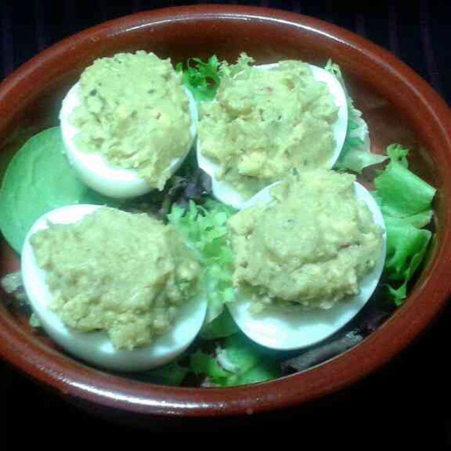 Primero pela y quita la pipa a los aguacates. Luego coloca la pulpa sobre una superficie lisa y aplastarla con un tenedor hasta que tenga una textura ligeramente fluida. En este paso a mí no me gusta utilizar la batidora, porque si no queda muy fino, la utilizo después cunado ya he unido todos los ingredientes, pero puedes usarla. Luego, le añadimos el zumo de limón, la cebolla y el ajo. Cuando lo tengamos todo muy bien picado lo mezclamos junto con el aguacate y le damos una pasada con la batidora para homogenizar, luego le damos el punto de sal, y añadimos un poco de ajo si nos ha quedado muy soso y está listo para tomar. Cocemos los huevos, los abrimos a la mitad y mezclamos la yema con el guacamole, las cucharadas que hagan falta para que quede bien mezclado. Rellenamos los huevos y ya estarían listos, están bueniiisimoooos.