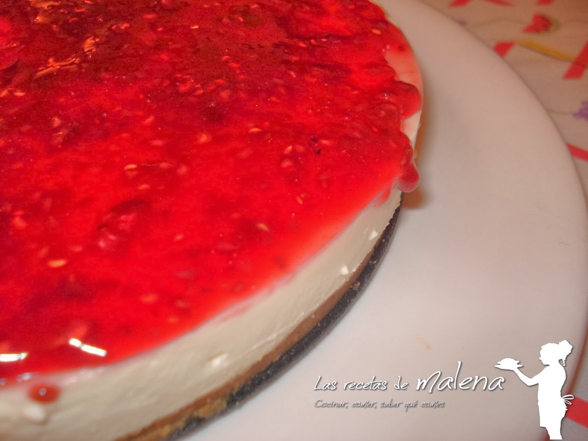 Esta es una de mis tartas preferidas, con una textura muy delicada y un suave sabor a queso que se complementa con mermelada de frambuesa