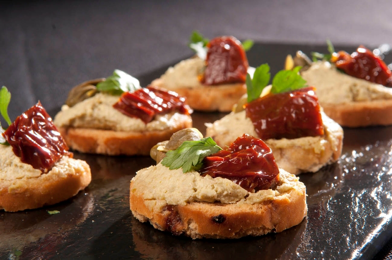 En nuestro caso, extenderemos nuestro hummus (vamos a ser generoso@s) sobre nuestras tostas. Ponemos ligeras notas de color espolvoreando el pimentón dulce e incluso 2 ó 3 garbanzos sobre el "paté" y un chorrito de aceite de oliva. Otra forma, sería en copas individuales acompañado de unos crudites (bastoncitos de verdura cruda, tales como zanahoria, apio, pimiento....)