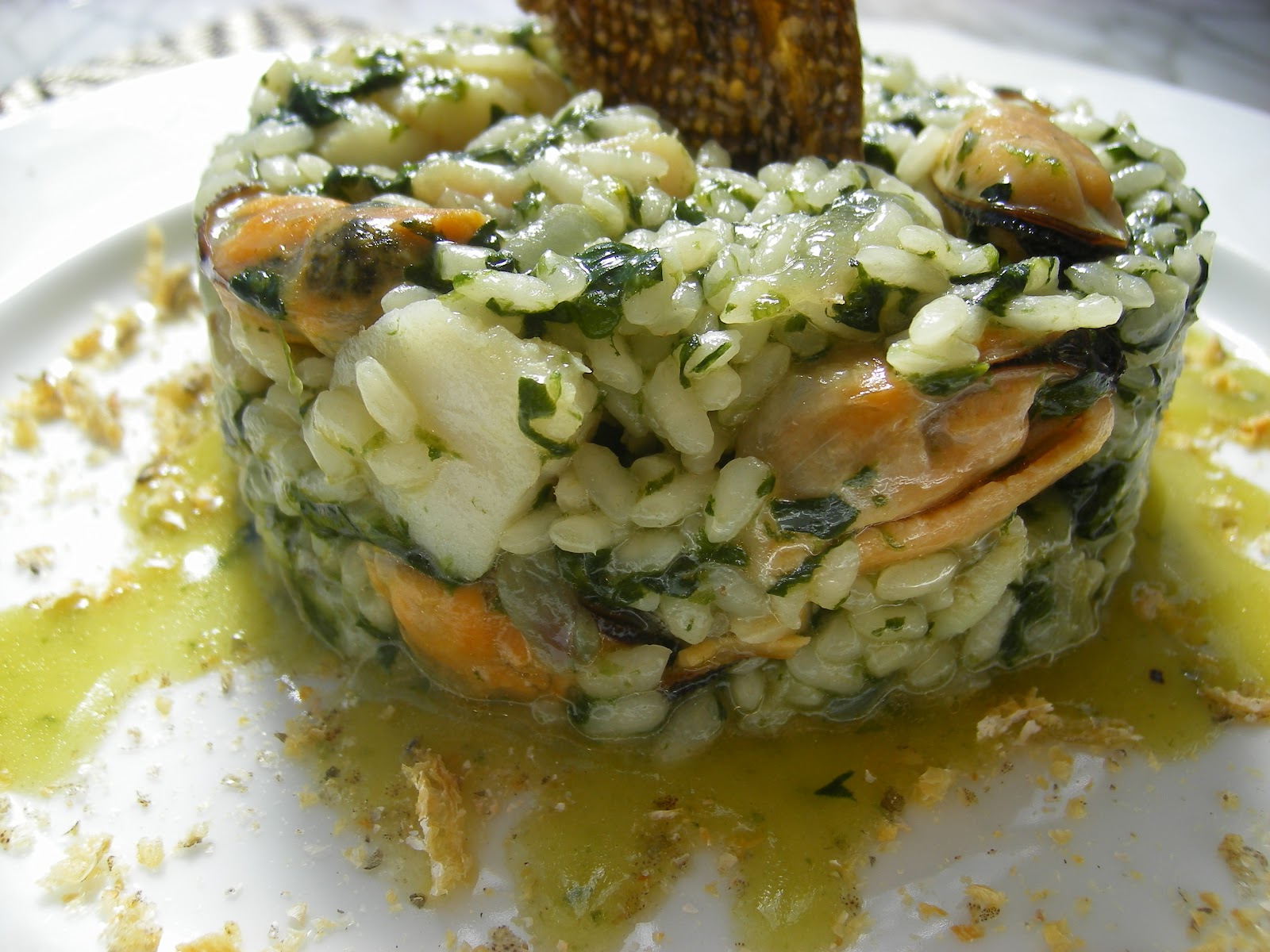 Seguidamente picamos y sofreímos las cebollas, cuando este transparente incorporar el arroz y el azafrán dándole unas vueltecitas para que se empape bien del sabor a cebolla y azafrán, inmediatamente agregamos el caldo de los mejillones con agua y agregar el arroz (ya sabéis 2 medias y media de liquido por una de arroz). Lo ponemos a cocer todo durante 5 minutos a fuego fuerte y unos 15 a fuego normal. Agregamos los mejillones, apagamos el fuego y para darle nuestro toque maestro meteremos nuestro arroz en el horno a 150° durante 5-8 minutos aproximadamente. Por último decoramos con perejil picado y listo para sorprender a nuestros comensales