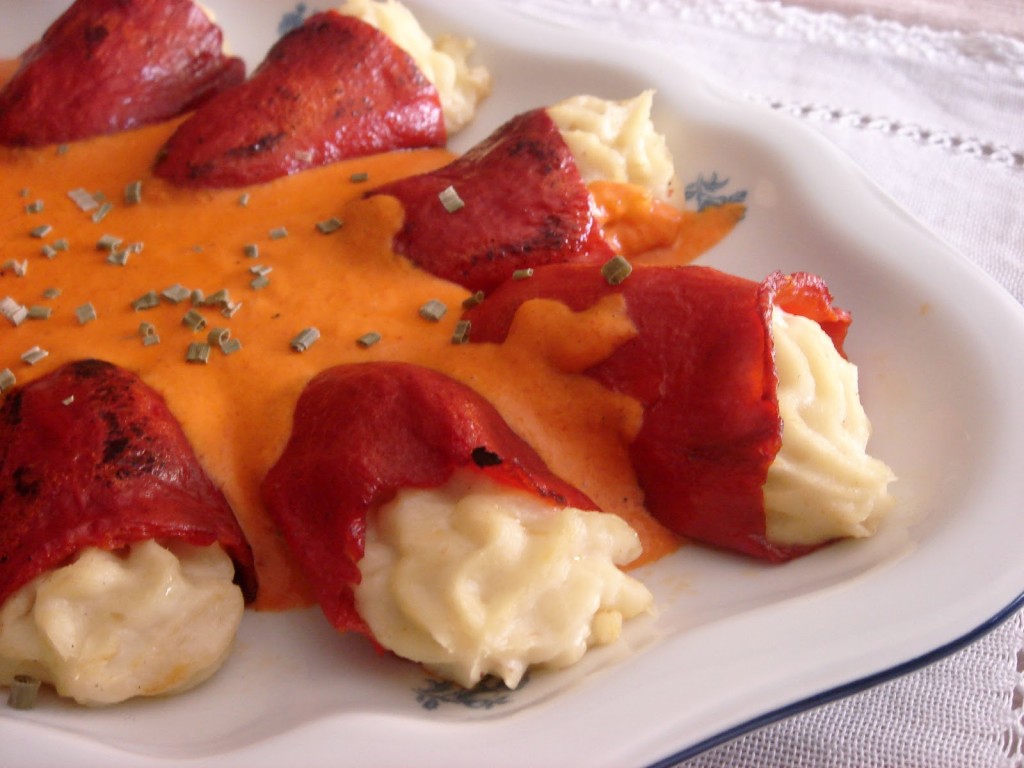 Piquillos rellenos de brandada de bacalao con confitura de tomate