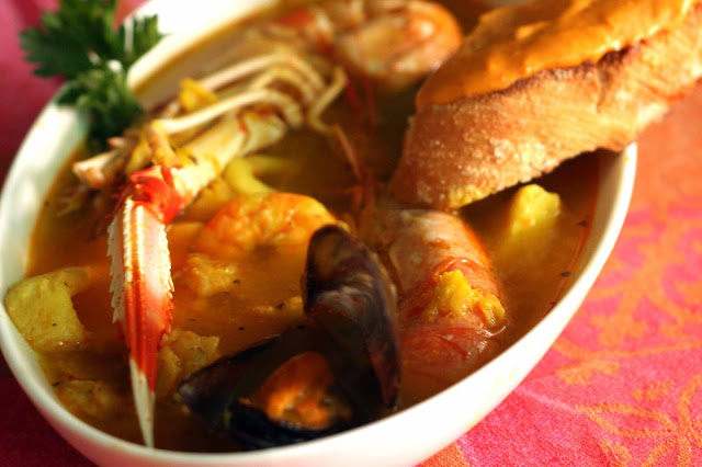 Limpiamos los pescados cortando el cabracho en 2 filetes y reservamos la cabeza y las espinas para el caldo. En un olla 3 l. ponemos la cabeza y las espinas de el cabracho, el 1/2 kg. de pescado de roca, el congrio, los cangrejos de mar y la 1/2 cabeza de rape, dejándolos cocer, durante 30 minutos.