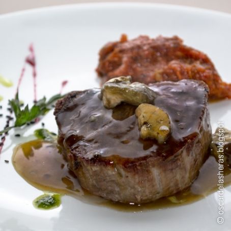 Aplasta un poco los filetes hasta lograr un grosor de unos 4 centímetros. Los untan con aceite y se espolvorean con la pimienta, se reservan. Cuando tengamos la parrilla o plancha muy caliente ponemos sobre ella los solomillos y se asan unos 7 u 8 minutos por cada lado.