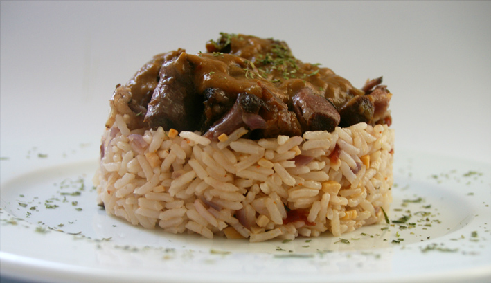 El primer paso es cortar en dados nuestra carne y marinarla en ajo picado, un chorrito de salsa de soja sal y pimienta. Pasadas unas 3 horas, rehogamos el arroz en el aceite de sésamo durante 3 minutos aproximadamente y cuando esté bien impregnado del aroma y sabor del sésamo añadimos nuestra carne macerada removiéndola durante unos dos minutos más para que quede bien sellada y así mantener su jugo dentro. En ese momento agregamos los brotes de soja y la cucharada de sake para dejar que este se evapore a fuego lento. Cuando notemos la evaporación del licor de arroz echaremos nuestro caldo de buey en una proporción de 3 medidas de caldo por una de arroz. Subimos a fuego máximo durante 5 minutos hasta que rompa el hervor y entonces bajamos la potencia del fuego y dejamos cocer despacito durante 20 minutos mas y ya tenemos nuestro arroz listo.