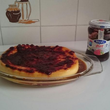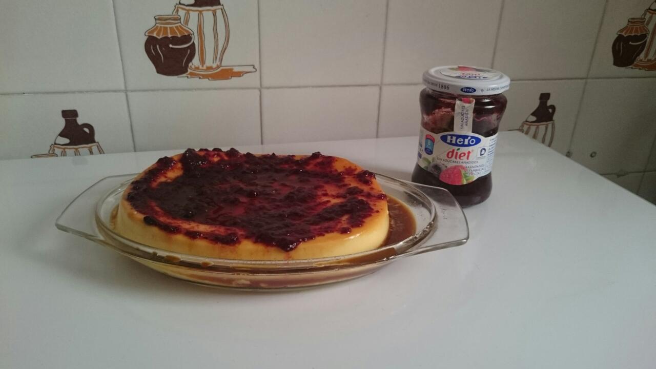 Primero se bate los huevos, el azúcar y la leche, se pone 15 min al baño maría en un molde caramelizado y en cuando se enfría se le da la vuelta en un plato y se hecha mermelada de hero diet frutas del bosque.