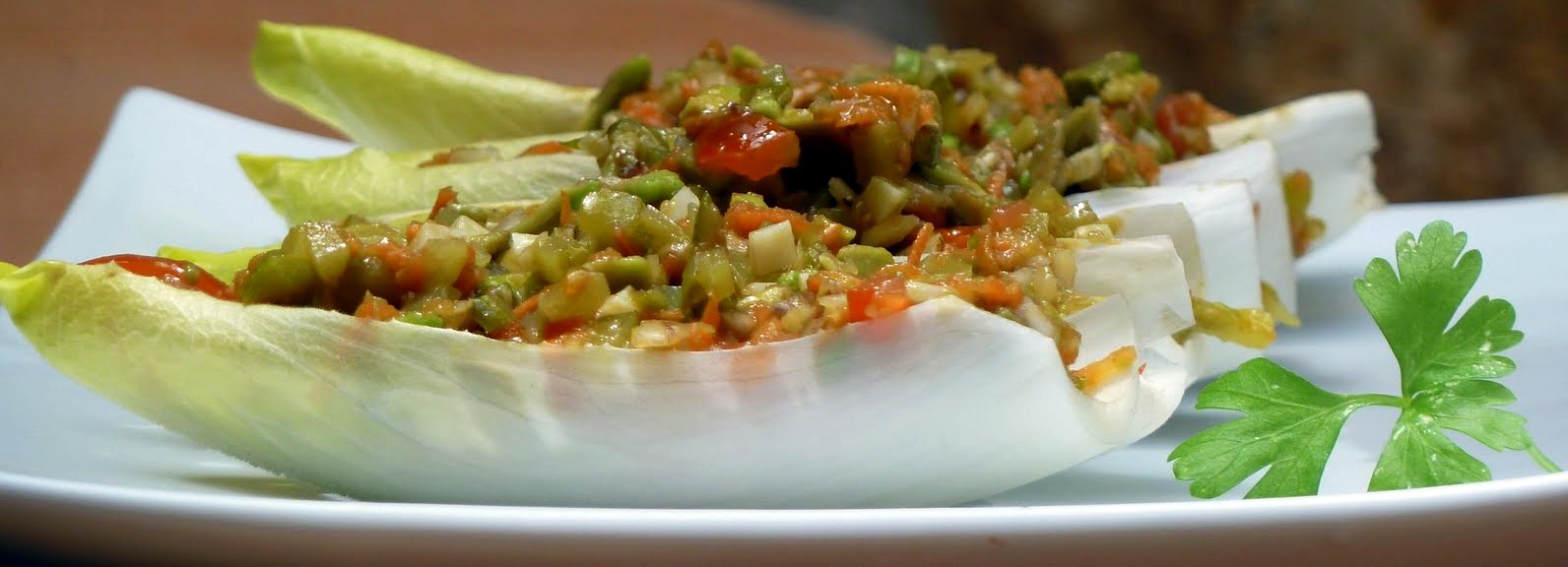 Empezamos sacando las hojas de las endibias y lavándolas un poco, dejamos escurrir, mientras tanto cortamos todos los ingredientes en trocitos pequeños y los vamos echando en un bol un poco hondo, cuando tengamos todo cortado lo aliñamos echándole primero la sal, el vinagre de módena y por último el aceite de oliva removemos y vamos llenando las barquitas de endibias, listo para comer.