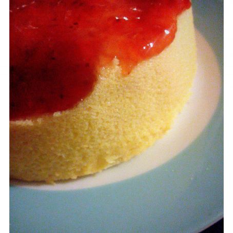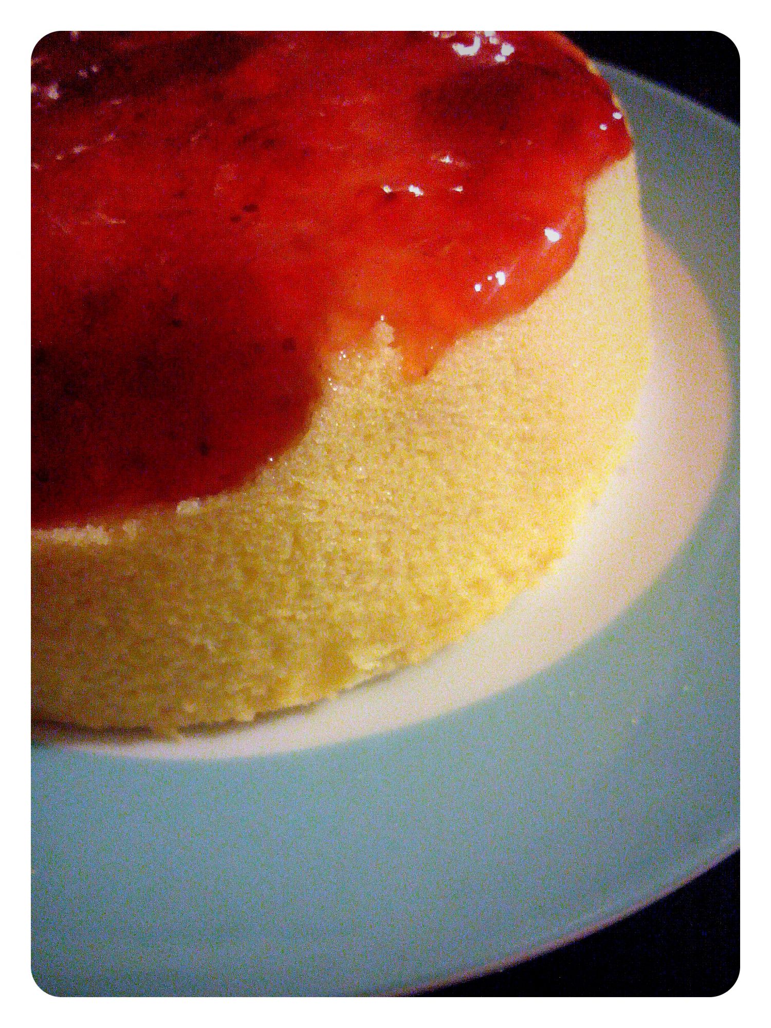 Esponjoso pastel típico de Japón. No es dulce completamente, por lo que pega muy bien con la mermelada como decoración.